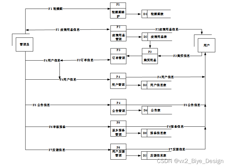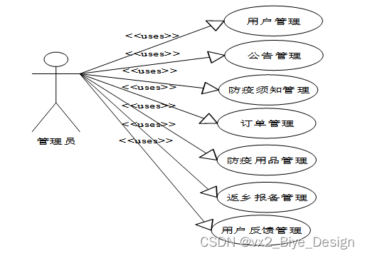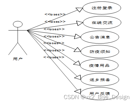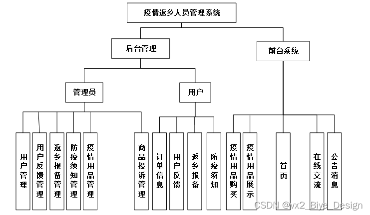 疫情返乡人员管理系统的前台中,用户模块主要实现:防疫须知查询、疫情用品购买、返乡报备以及进行用户反馈交流的功能。疫情返乡人员管理系统的后台中,管理员对用户在前台提交产生的数据进行处理,以满足用户的需求。前台系统和后台系统有数据交互,整个系统各个部分相互独立又密不可分。后台的功能主要包括用户管理、公告管理、防疫须知管理、疫情用品管理、返乡报备管理、用户反馈管理、交流管理等。