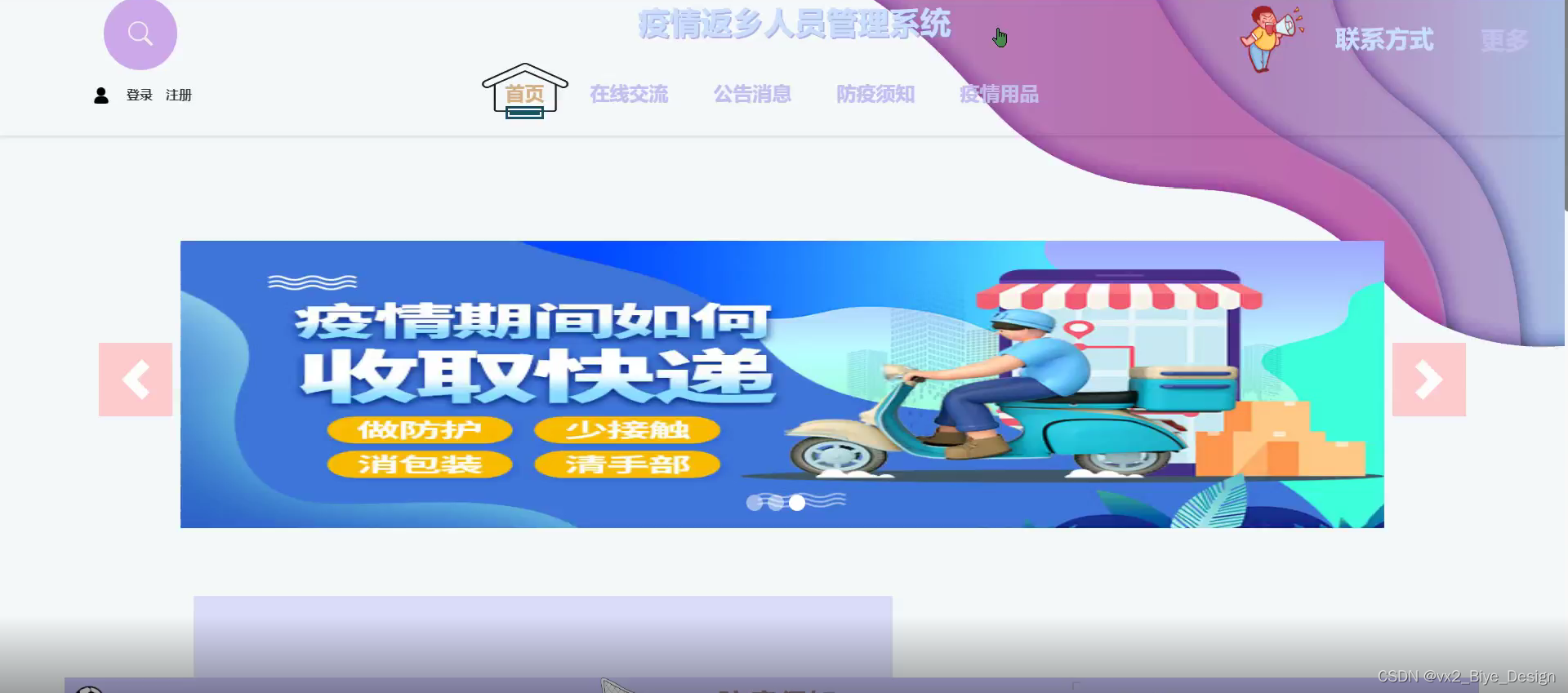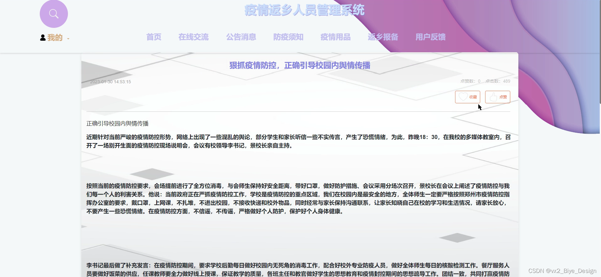 本文针对疫情返乡人员管理系统的特点和用户需求,利用 Python相关技术、Django框架和等技术,通过详细的需求分析、页面设计和功能设计,系统利用JQuery 技术和 CSS 技术进行了页面设计,实现了包括用户模块、防疫须知模块、疫情用品模块、返乡报备模块的前台系统以及包括用户管理模块、用户反馈管理模块、防疫须知管理模块的后台系统。并添加了用户的访问控制,建立了一个完整、健壮、安全稳定的疫情返乡人员管理系统。