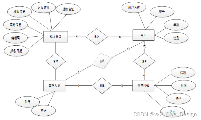 (3)确定好系统使用的技术,进行在线确认系统所划分的用户角色,并且根据用户角色划分确定所要设计的功能模块,对疫情返乡人员管理系统的设计主要划分别为管理员和用户角色,并所使用的功能模块也相应不同,但是系统的数据库实现的内容是交互的,用户可以随时根据自己的需求进行疫情政策的查询以及进行返乡报备,对于系统工作人员可以根据自己的分管内容进行在线信息的处理及操作,管理员获取到所有用户的详细数据信息,并根据需求进行第一时间处理解决。