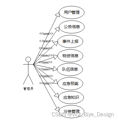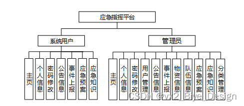 应急指挥平台在对需求做解析后,整个系统主要分为两个部分:管理员和系统用户,每个模块下的分支功能不一样。对功能做出如下说明: