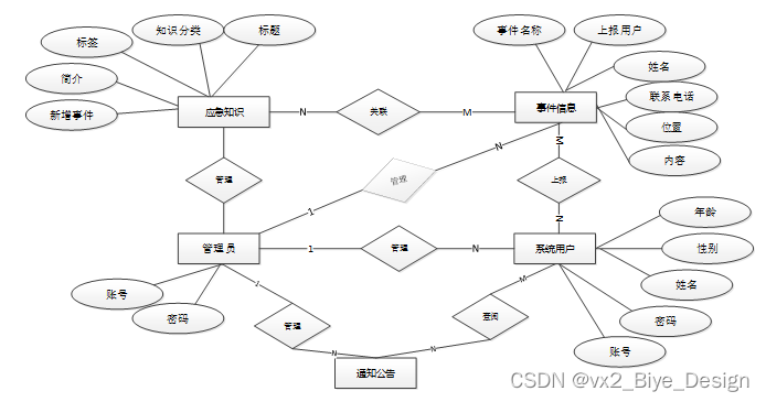 对于一个要开发的系统来说,E-R图可以让别人能更快更轻松的了解此系统的事务及它们之间的关系。根据系统分析阶段所得出的结论确定了在应急指挥平台中存在着多个实体分别是用系统用户、管理员、事件、应急预案,应急知识等。