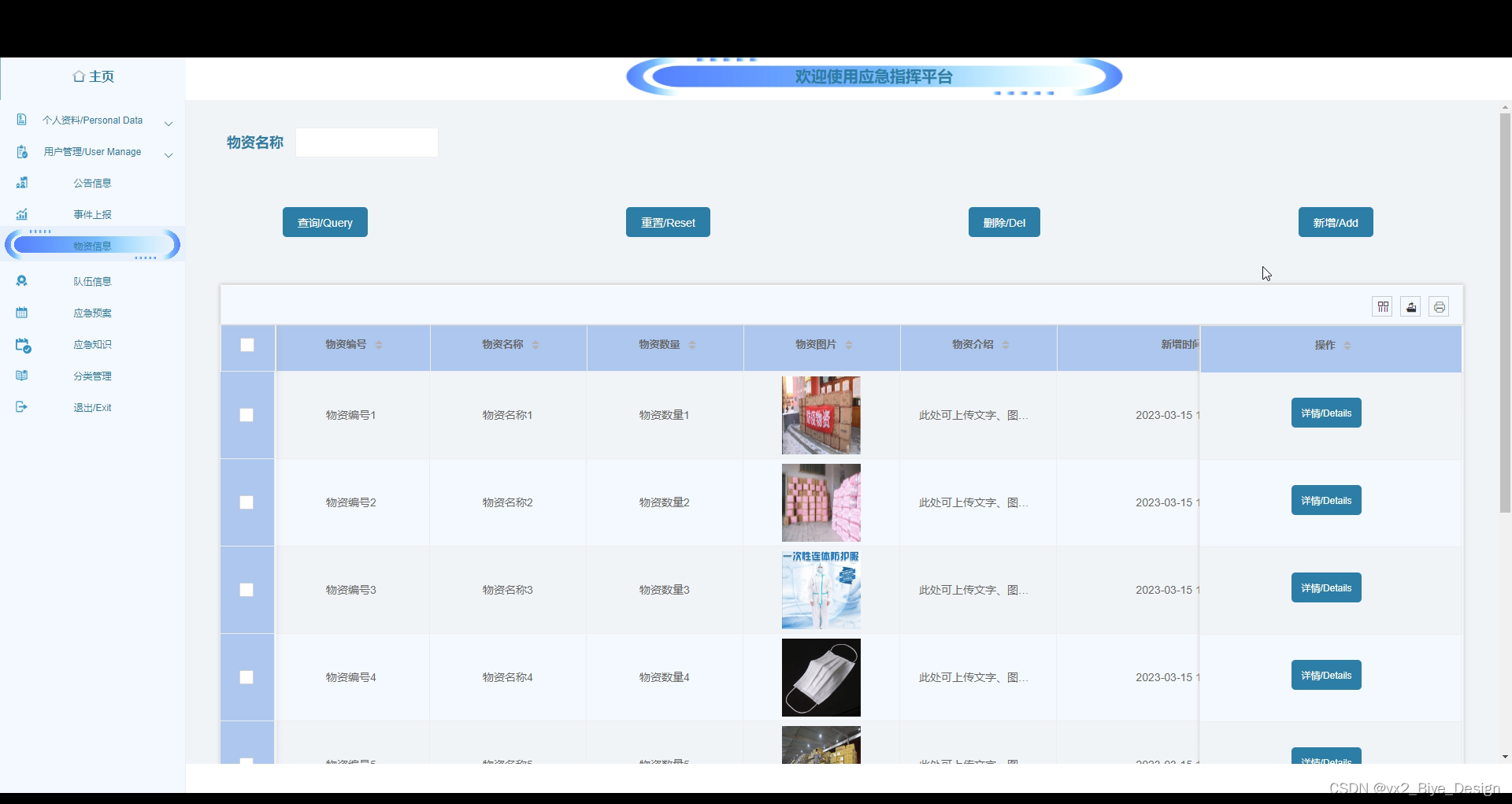 管理员在此页面可以查看物资编号,名称,数量,图片等信息。可以进行重置,新增等操作。如下所示。
