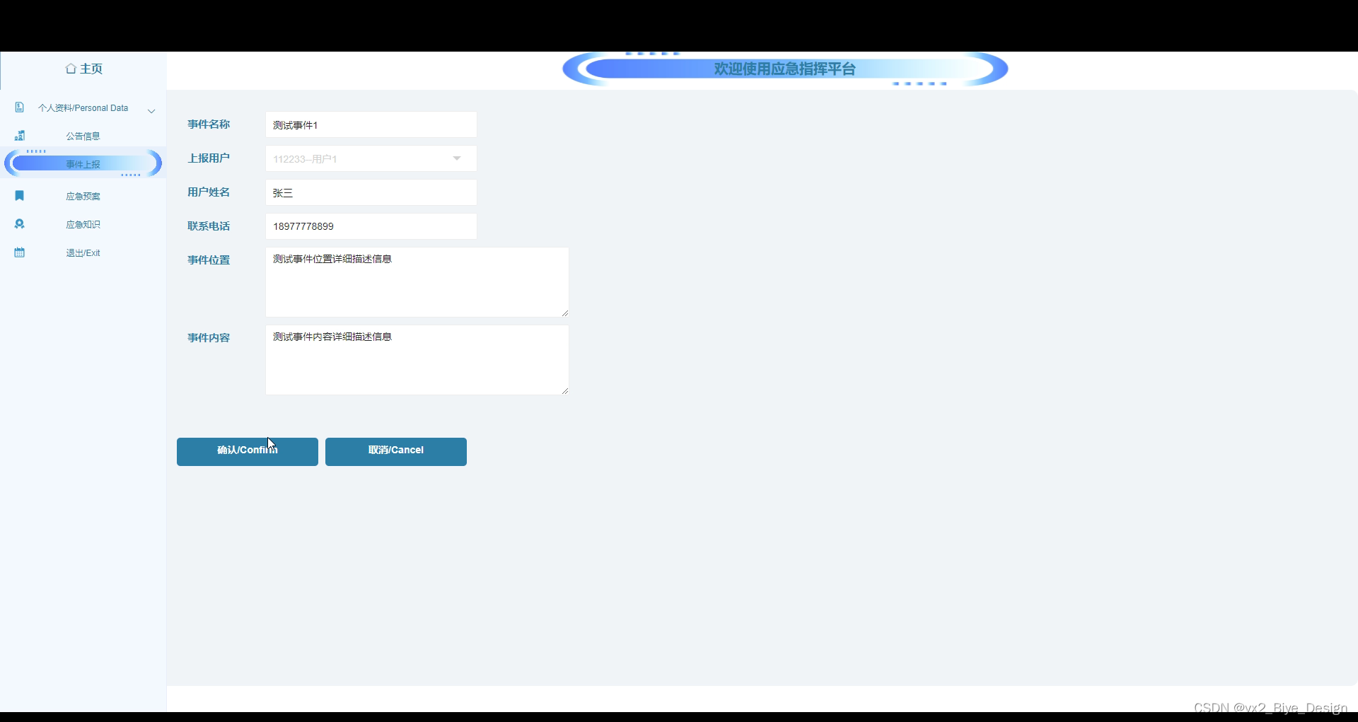 用户在此页面可以查看事件名称,上报用户,姓名,电话等详细事件信息。可以进行重置,新增等操作。如下所示。