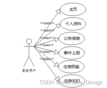 系统设计的目的是分析系统包括的所有功能结构,为开发人员设计开发和实现系统做好准备工作。经过前期的需求调查、分析和整理之后,确定的总体需求主要包括多个模块,分别是:主页,个人资料(个人信息,密码修改),用户管理(管理员,系统用户),公告信息,事件上报,物资信息,队伍信息,应急预案,应急知识,分类管理等。系统整体角色分为两个部分,一是系统用户、二是管理员。权限分布也是很明显,系统用户是在除去浏览信息之外还具有查询和管理自己账户信息,公告信息,事件上报,应急预案,应急知识等权限;管理员是最高权限拥有者。