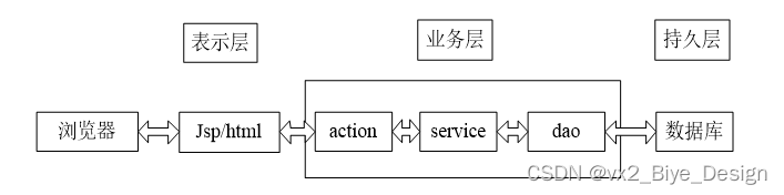 页面发送请求给控制器,控制器调用业务层处理逻辑,逻辑层向持久层发送请求,持久层与数据库交互,后将结果返回给业务层,业务层将处理逻辑发送给控制器,控制器再调用视图展现数据。
