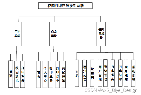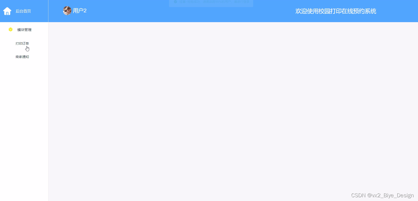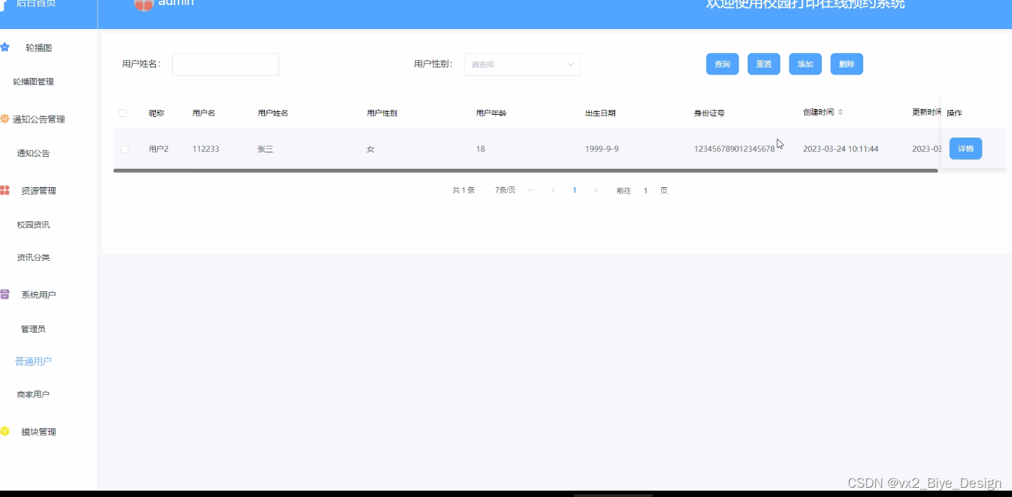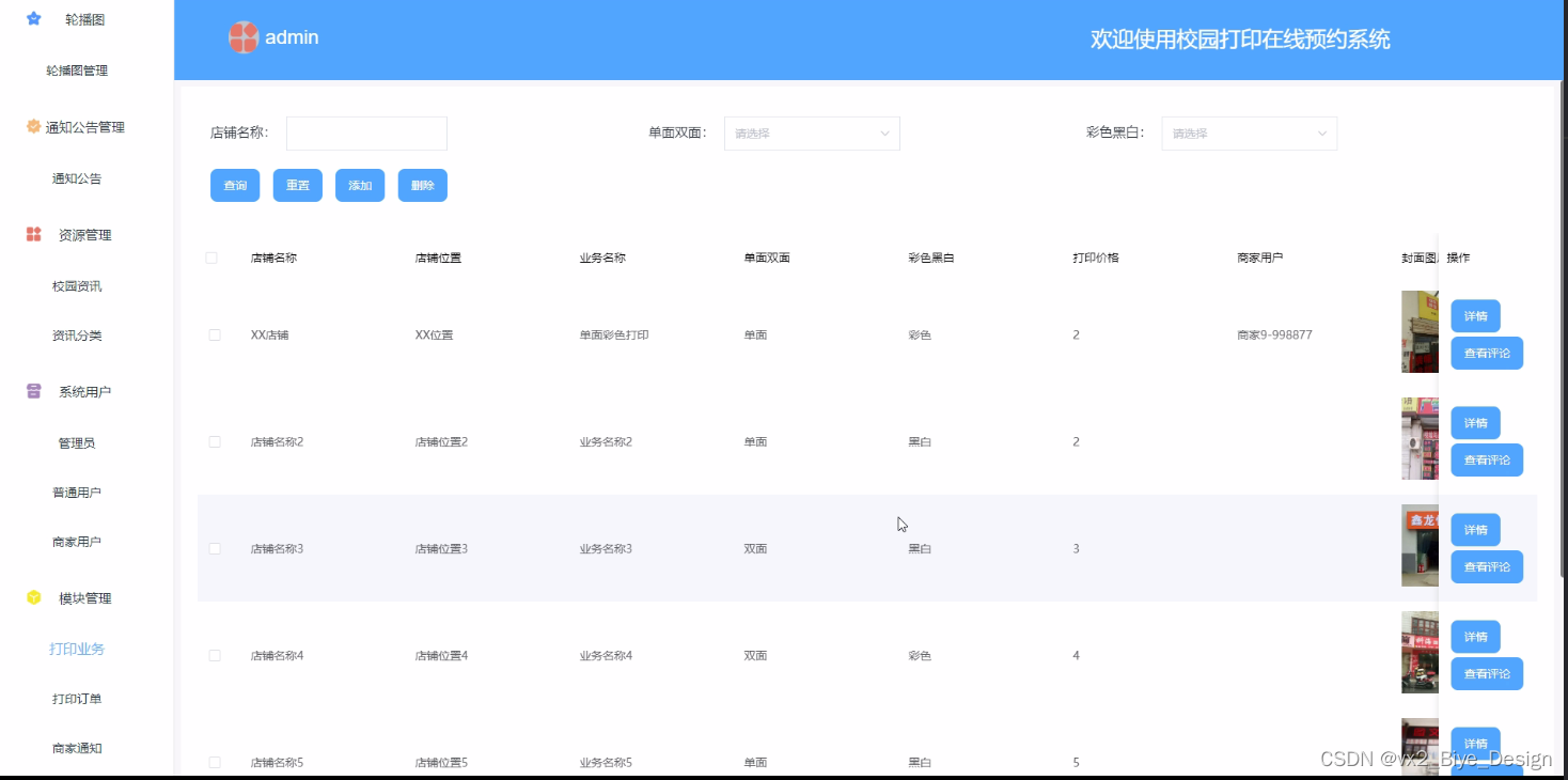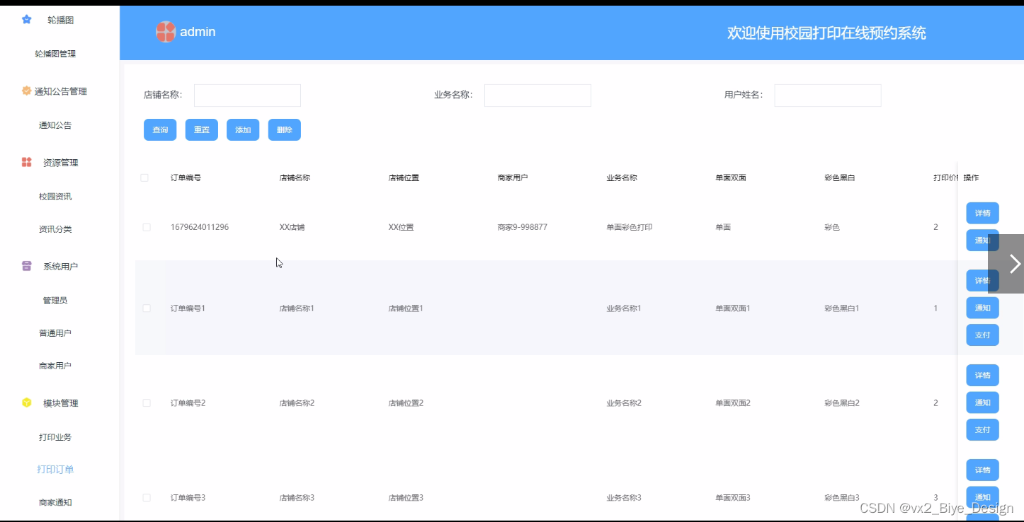 2. 系统功能还不够完善,无法提供丰富多彩的在线功能,只能实现管理员:首页、轮播图、通知公告、资源管理(校园资讯、资讯分类)系统用户(管理员、普通用户、商家用户)模块管理(打印业务、打印订单、商家通知)一系列功能。