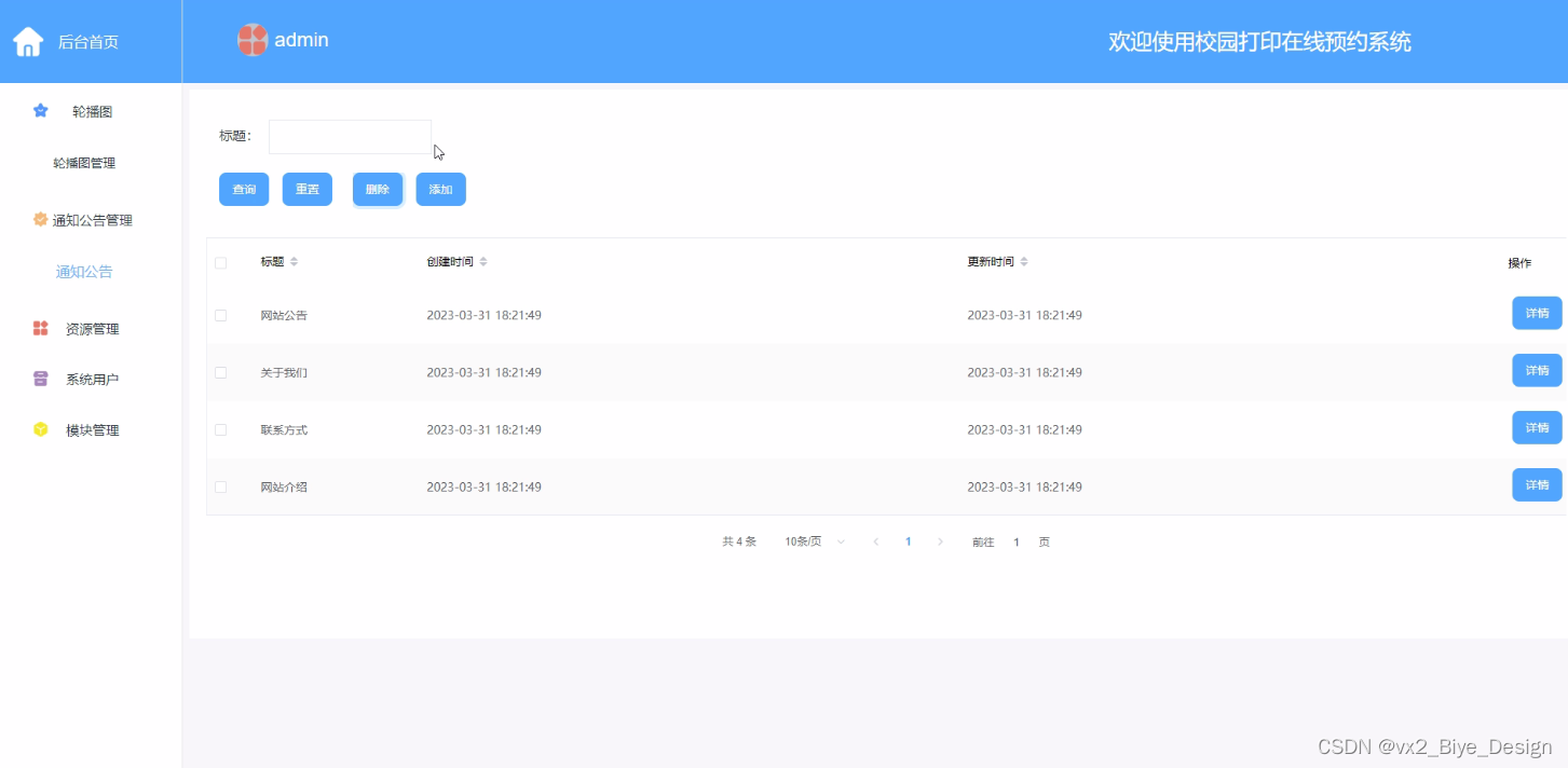 管理员登录进入校园打印在线预约系统可以查看系统首页、轮播图、通知公告、资源管理(校园资讯、资讯分类)系统用户(管理员、普通用户、商家用户)模块管理(打印业务、打印订单、商家通知)等信息,如图4-7所示。