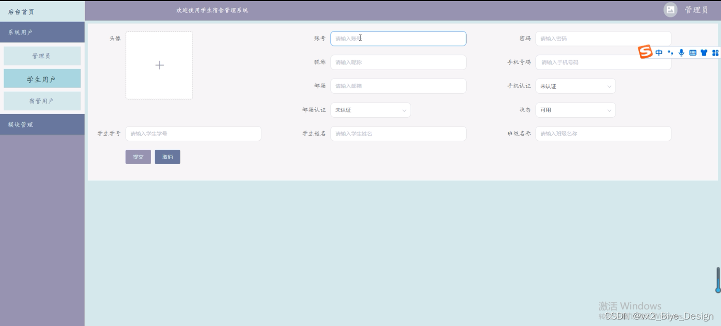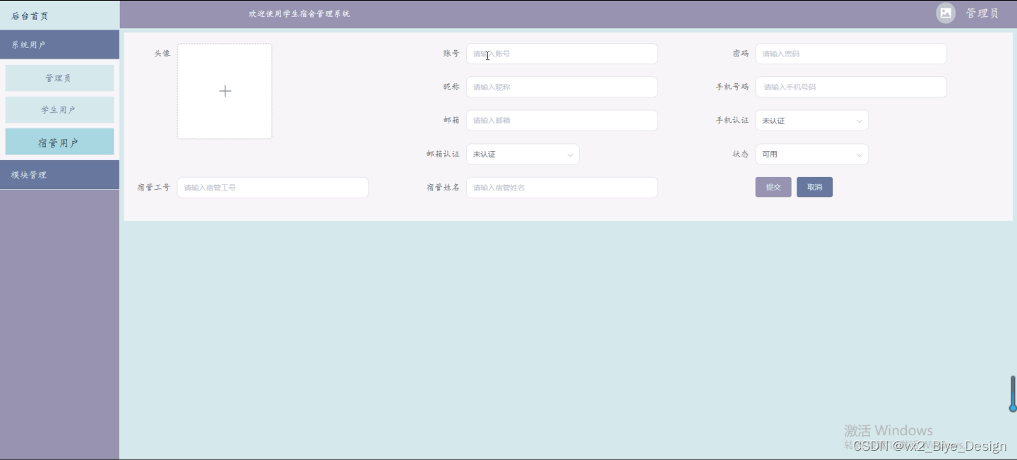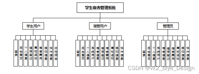 (1)功能要求:后台首页,系统用户(管理员、学生用户、宿管用户)模块管理(宿舍信息、维修登记、离校返校、宿舍费用、晚归信息、快件信息)个人信息等功能模块。