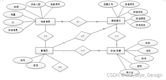 通过学生宿舍管理系统的功能进行规划分成几个实体信息,实体信息将通过ER图进行说明,本系统的主要实体图如下: