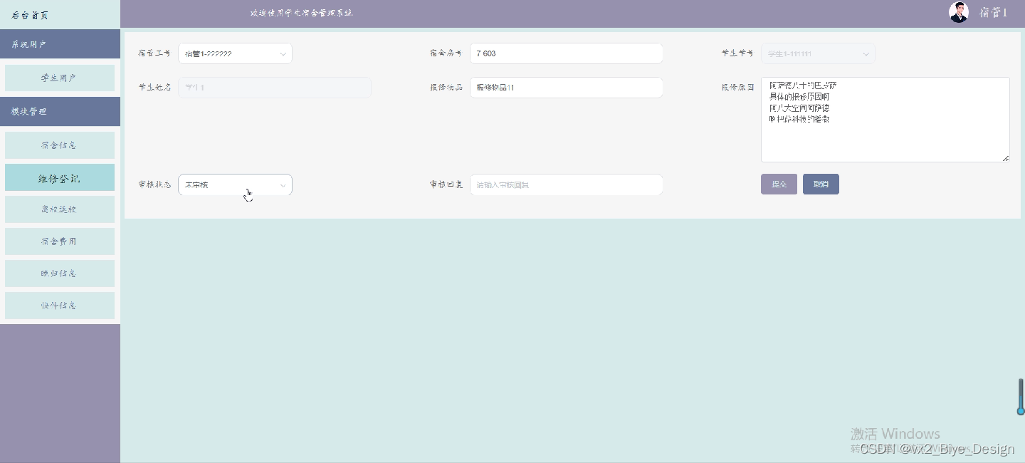 维修登记:宿管用户可在此页面查看学生申请的维修信息,如:宿管工号、宿舍房号、学生学号、学生姓名、报修原因、报修物品等详细信息,并进行审核回复操作,如图5-14所示。
