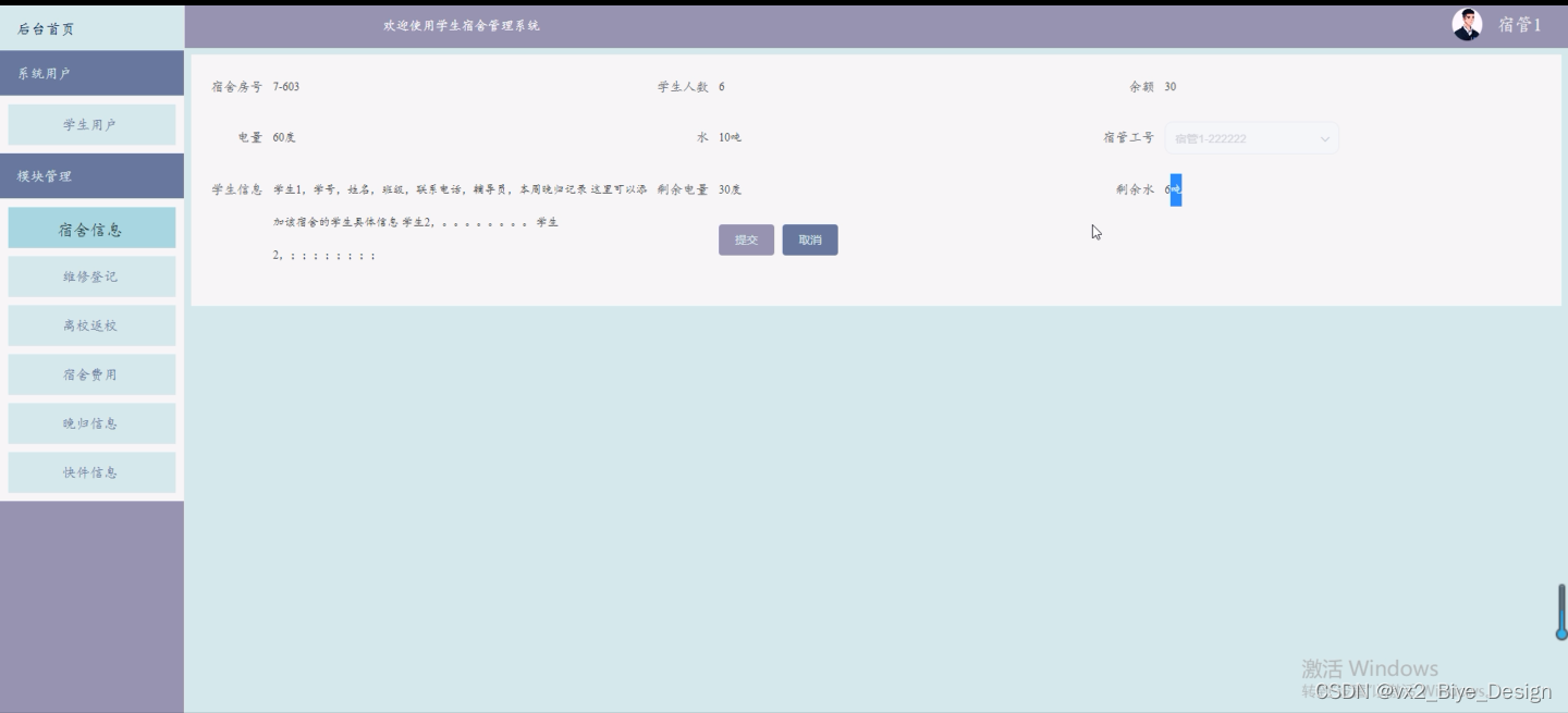 3、功能的完善性:拥有后台首页,系统用户(管理员、学生用户、宿管用户)模块管理(宿舍信息、维修登记、离校返校、宿舍费用、晚归信息、快件信息)个人信息等功能模块的修改维护操作。