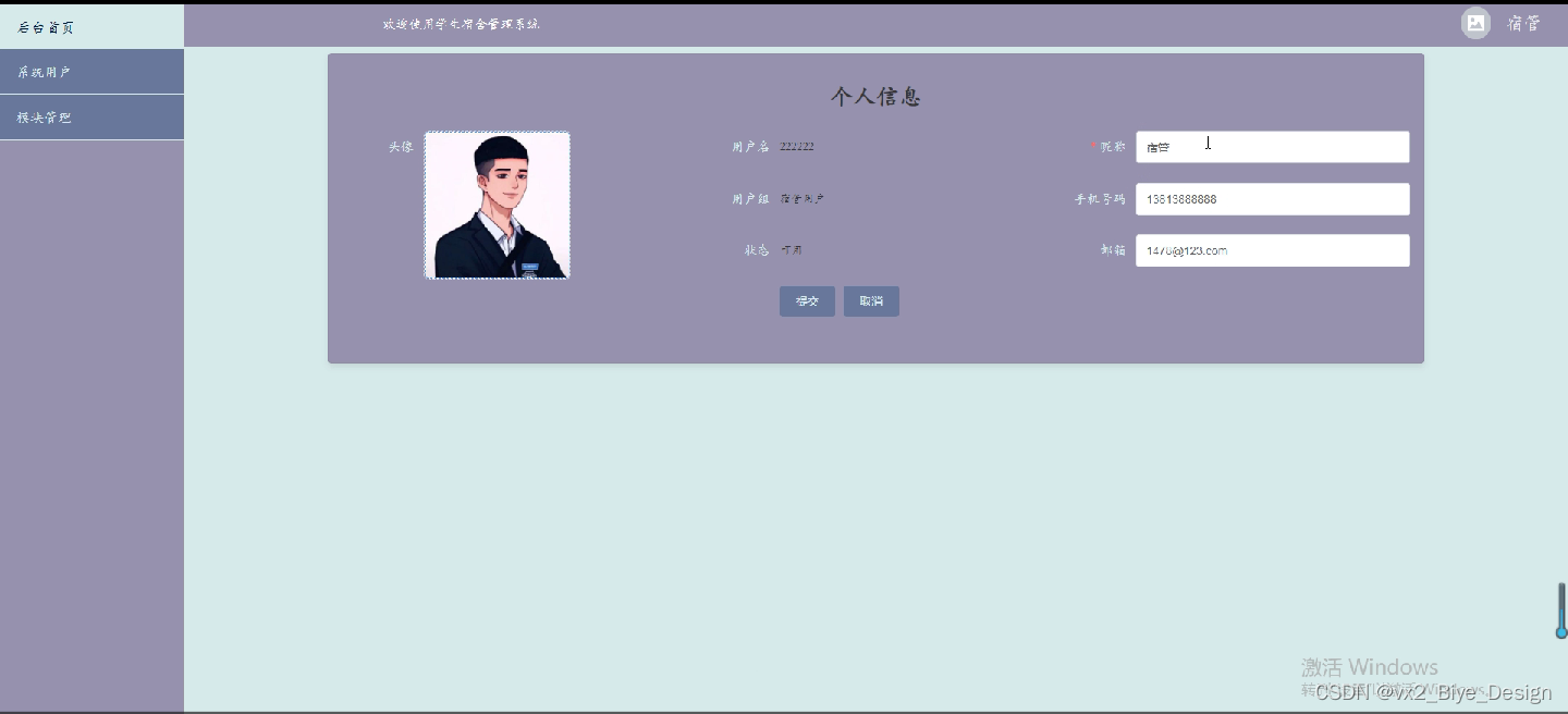 管理员进入系统后台可以查看:后台首页,系统用户(管理员、学生用户、宿管用户)模块管理(宿舍信息、维修登记、离校返校、宿舍费用、晚归信息、快件信息)个人信息等功能,还可进行相应的操作,如图5-2所示。