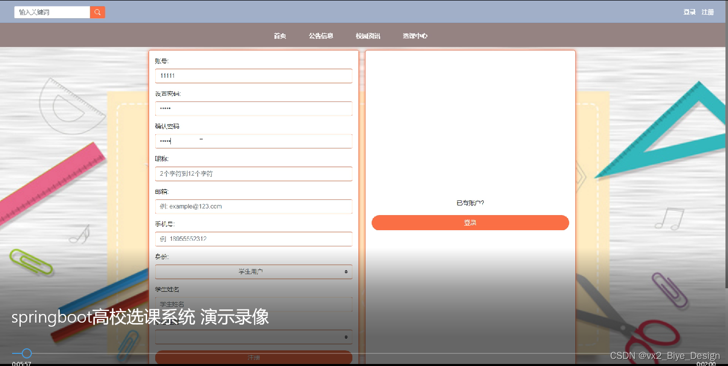 学生用户登录高校选课系统,需先注册,在登录页面输入用户名、密码进行登录,如图5-13,5-14所示。