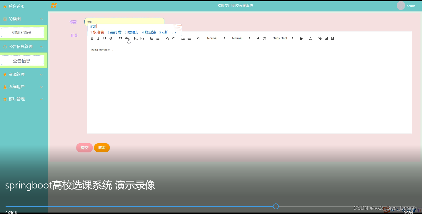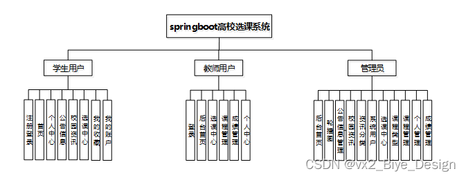 (1)功能要求:首页,轮播图管理,公告信息管理,人员管理(管理员,教师用户,学生用户),资源管理(校园资讯、新闻分类),模块管理(选课中心、课程类型、课程管理、成绩管理),个人管理等功能模块。