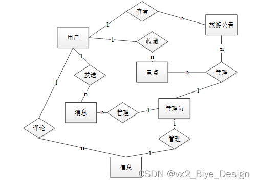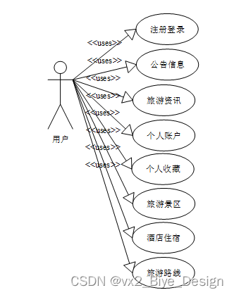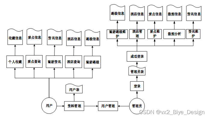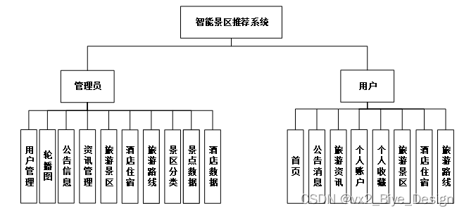 根据对系统的功能进行分析可以总结智能景区推荐系统的具体功能模块包括下面的几个主要的功能模块:该系统主要从两大模块进行设计的,首先就是用户参与操作需要的模块,此外还需要有管理员用到的模块,两者之间不是互相独立的,他们之间有着密切的联系,同数据库表中的数据连接起来进行操作。每个模块访问相同的数据库,但访问的表不同。系统的各个功能模块是根据所收集的资料研究得到的。在以上分析功能的基础上,系统模块分为多个模块。用户含有的功能有首页、公告消息、旅游资讯、个人账户、个人收藏、旅游景区、酒店住宿、旅游路线等,退出登录等功能,管理员含有的功能有修改密码,用户管理、景点管理、景点类型、酒店信息、旅游路线、数据分析等功能。