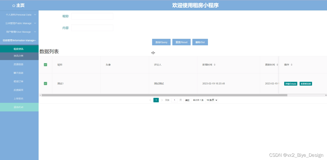 租房资讯管理,在租房资讯管理页面中可以对租房信息昵称、头像、标签、描述、分类、评论人等信息进行回复添加、删除或详细等操作,如图5-10所示。