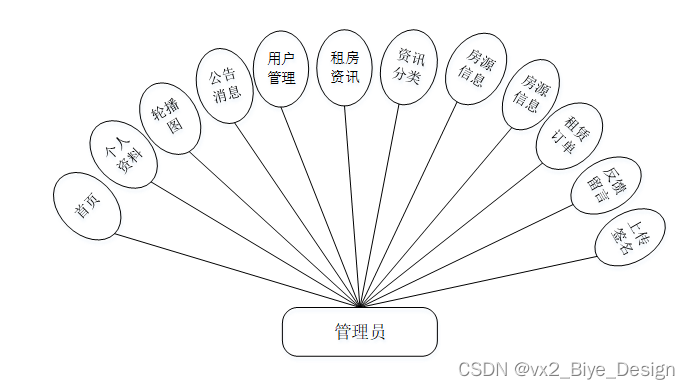 (1)管理员模块:系统中的核心户主是系统管理员,管理员登录后,通过管理员菜单来管理后台系统。主要功能有:首页、个人资料(个人信息、修改密码)、公共管理(轮播图、公告信息)、用户管理(管理员、租户用户、户主用户)、信息管理(租房资讯、资讯分类)、房源信息、聊天信息、租赁订单、反馈留言、上传签名等。管理员用例图如图3-1所示。