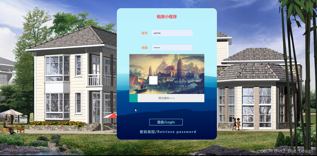 管理员登录,通过填写注册时输入的账号、密码、滑动滑块进行验证码进行登录,如图5-6所示。