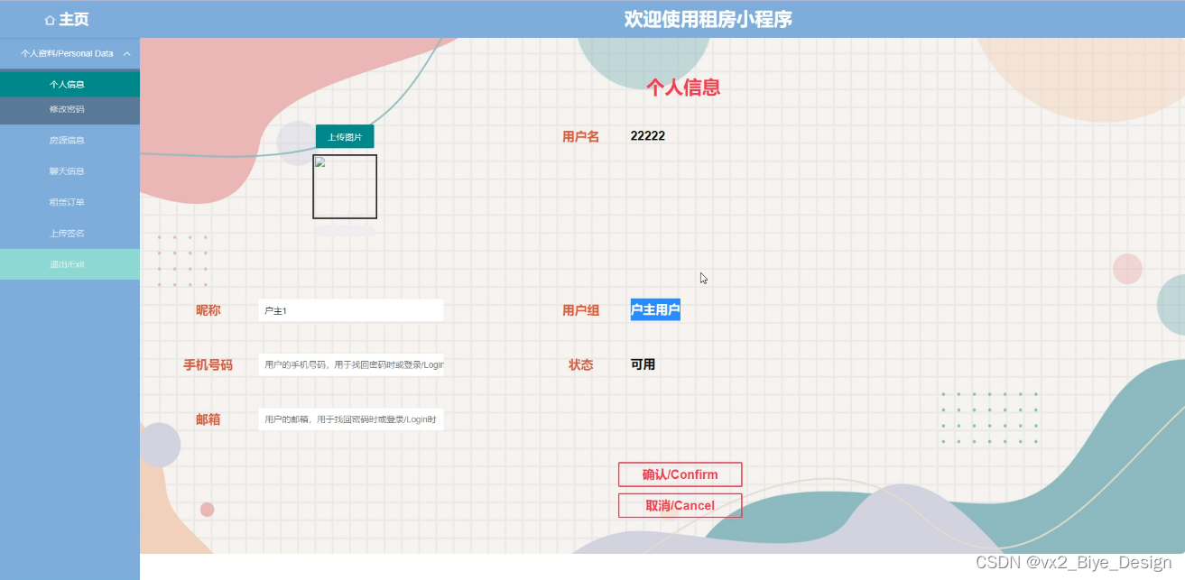 户主登录系统后台可查看功能有首页、个人资料(个人信息、修改密码)、房源信息、聊天信息、租赁订单、上传签名等功能,图5-13