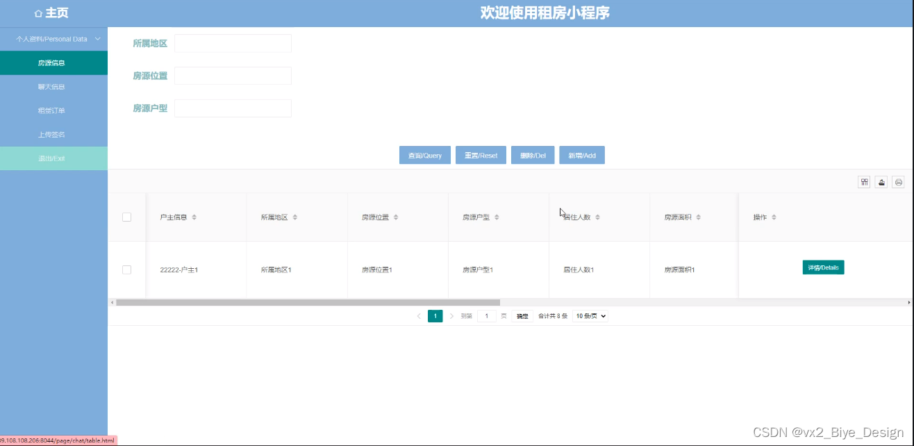 聊天信息管理,在聊天信息管理页面中可以对租户信息、租户姓名、户主信息、所属地区、房源位置、租赁价格、发送内容、内容回复等信息、进行添加或删除等操作,如图5-11所示。