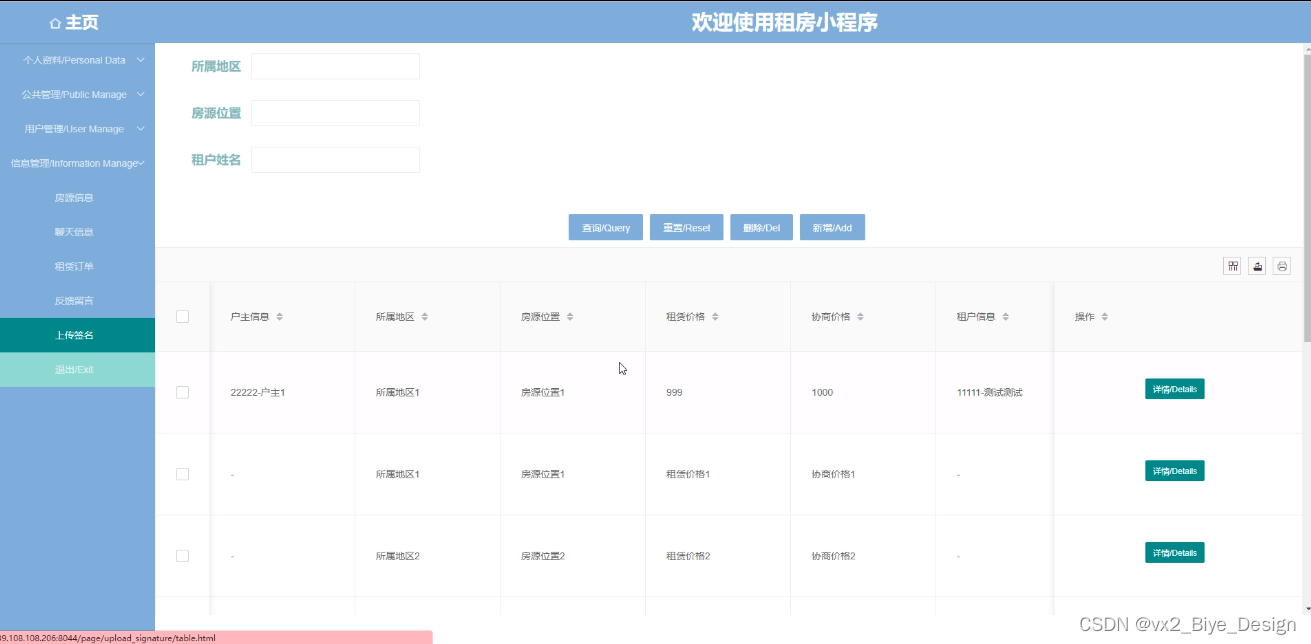 上传签名管理,在上传签名管理页面中可以看到户主信息、房源位置、协商价格、租户姓名、所属地区、租赁价格、租户信息等内容,进行添加或删除等操作,如图5-12所示。
