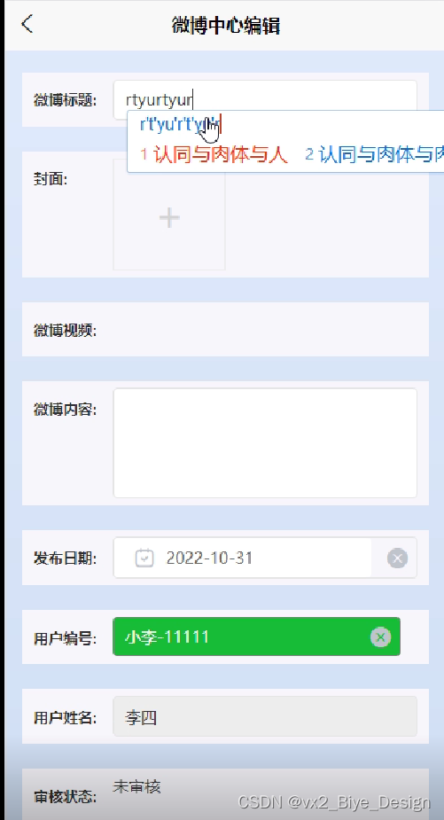 (4)微博中心:在前台点击“微博中心”可以进行个人微博的编辑,填写微博标题、编辑微博内容、上传封面图片以及相关视频,选择发布日期,点击“提交”按钮会显示自己发布的所有的微博信息,如果信息有错,点击“编辑”按钮可以对微博进行更新维护,也可以直接删除某一微博内容,同时设有审核功能,对用户提交的微博进行审核,。