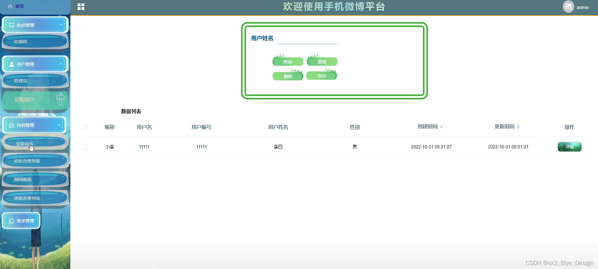 (2)用户管理:管理员可以对基于Android的手机微博平台中的用户人员进行增删改查。