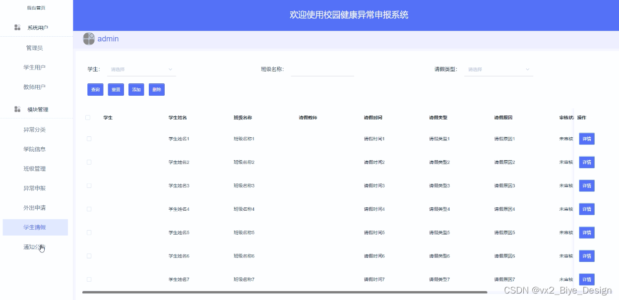 (5)学生请假:点击“学生请假”这个菜单,可以查看到系统中所有查询的学生请假信息,支持通过学生或者学生姓名对学生请假进行查询,如果想要了解某一学生请假的详细信息,点击后面的“详情”会进入详情界面;
