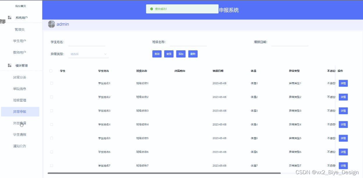 (5)异常申报:点击“异常申报”这个按钮可以查看到系统中所有的异常申报信息,支持通过学生姓名或者班级名称进行查询异常申报信息,如果想要添加新的异常申报信息,点击“添加”按钮然后根据提示输入异常申报信息,点击“提交”后,在异常申报界面就会显示新增的异常申报信息,可以点击某一异常申报信息查看异常申报信息的详情,也可以直接点击“删除”进行删除异常申报;