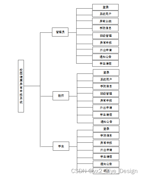 系功能模块的设计就是把系统具体要实现哪些功能,功能如何划分做一个系统的架构,以模块图的方式展示出来,方便我们进行功能得罗列以及涉及。在系统的功能方面,项目分成了管理员+学生+教师三个模块,每个模块登录进去对应相应的功能,具体的功能模块图如图3.1所示。