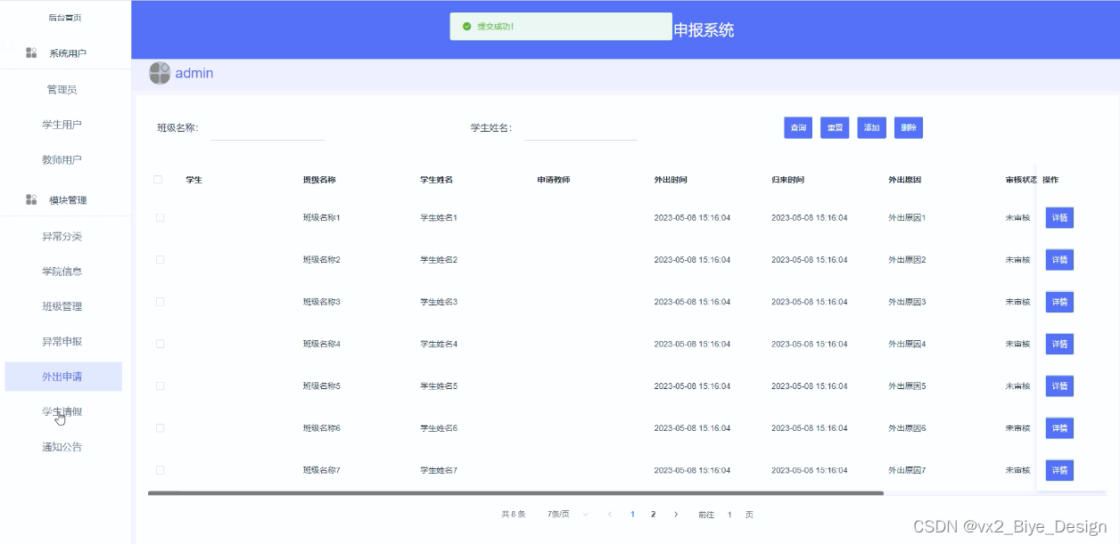 (6)外出申请:点击“外出申请”这个按钮可以查看到系统中所有的外出申请信息,支持通过学生或者班级名称进行查询外出申请信息,如果想要添加新的外出申请信息,点击“添加”按钮然后根据提示输入外出申请信息,点击“提交”后,在外出申请界面就会显示新增的外出申请信息,可以点击某一外出申请信息查看外出申请信息的详情,也可以直接点击“删除”进行删除外出申请;