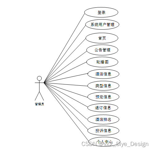 web后台管理上的管理员是维护整个酒店住宿预定系统中所有数据信息的。管理员角色用例如图2-4所示。