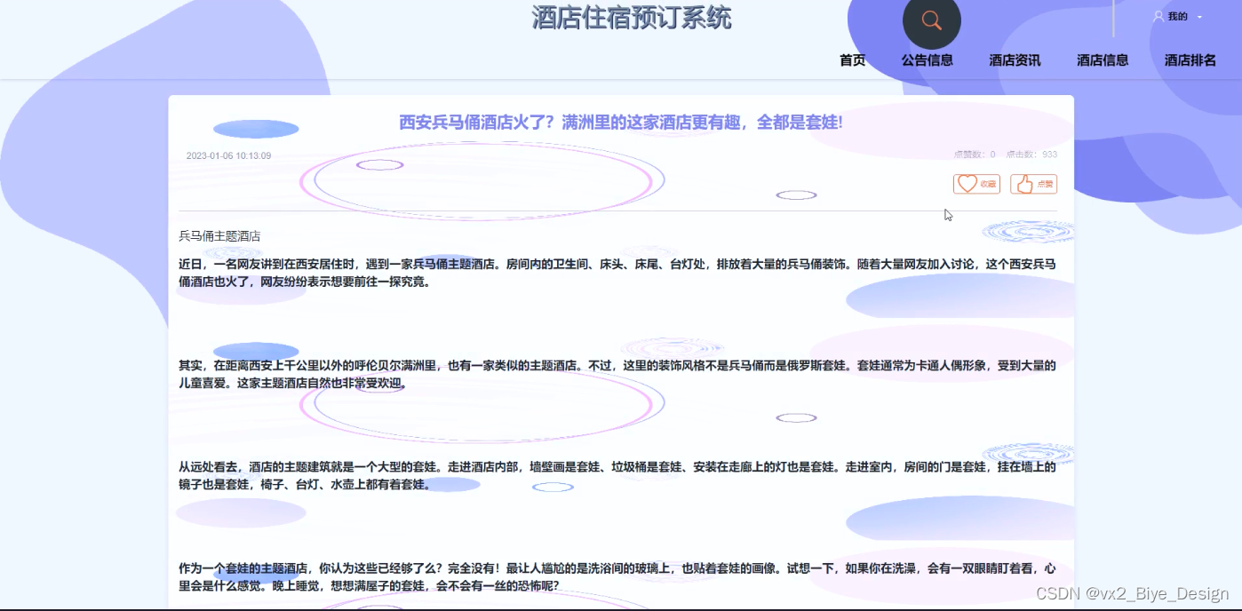 (4)酒店资讯:在首页导航栏上我们会看到“酒店资讯”这一菜单,我们点击进入进去以后,会看到所有管理员在后台发布的酒店资讯信息,能够对喜欢的酒店资讯进行点赞,如果下次想要更快的找到这篇资讯,也可以进行收藏、评论;