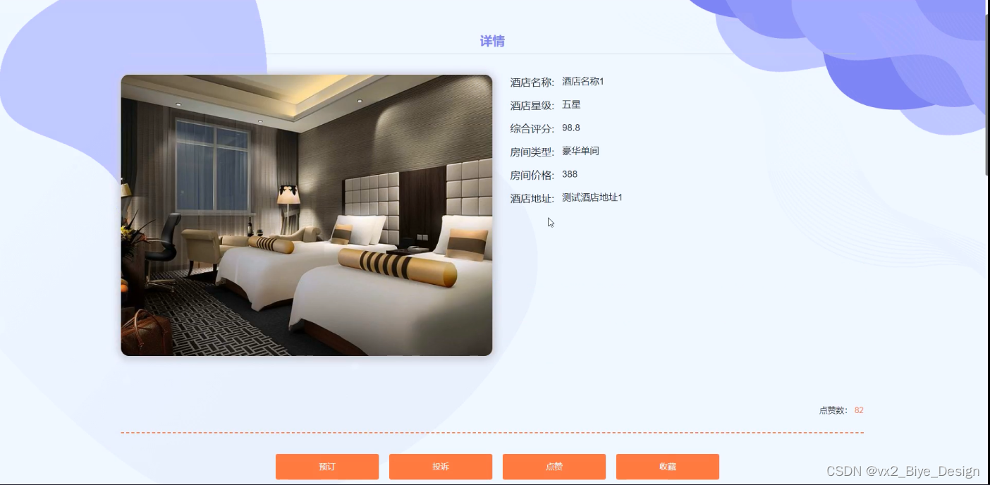 (5)酒店信息:在首页导航栏上我们会看到“酒店信息”这一菜单,我们点击进入进去以后,会看到所有管理员在后台发布的酒店信息,我们选择想要了解酒店的预定信息,可以预定+投诉+点赞+收藏+评论;