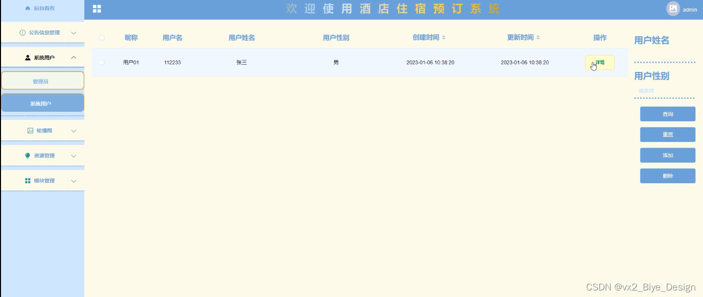 酒店住宿预定系统中的管理人员是可以对前台注册的用户进行管理的,也可以对管理员进行管控。界面如下图4-8所示。