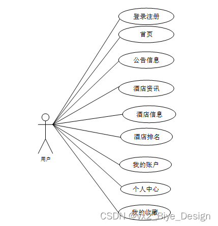 通过2.3功能的分析,得出了本酒店住宿预定系统的用例图: