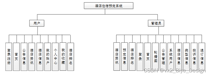 按照酒店住宿预定系统的角色,我划分为了系统用户管理模块和管理员管理模块这两大部分。