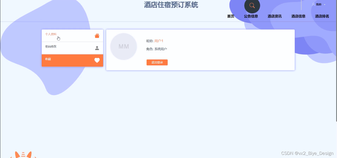 (7)个人中心:当用户点击右上角“我的”这个按钮,就会进入到对应的后台进行信息的管理了;
