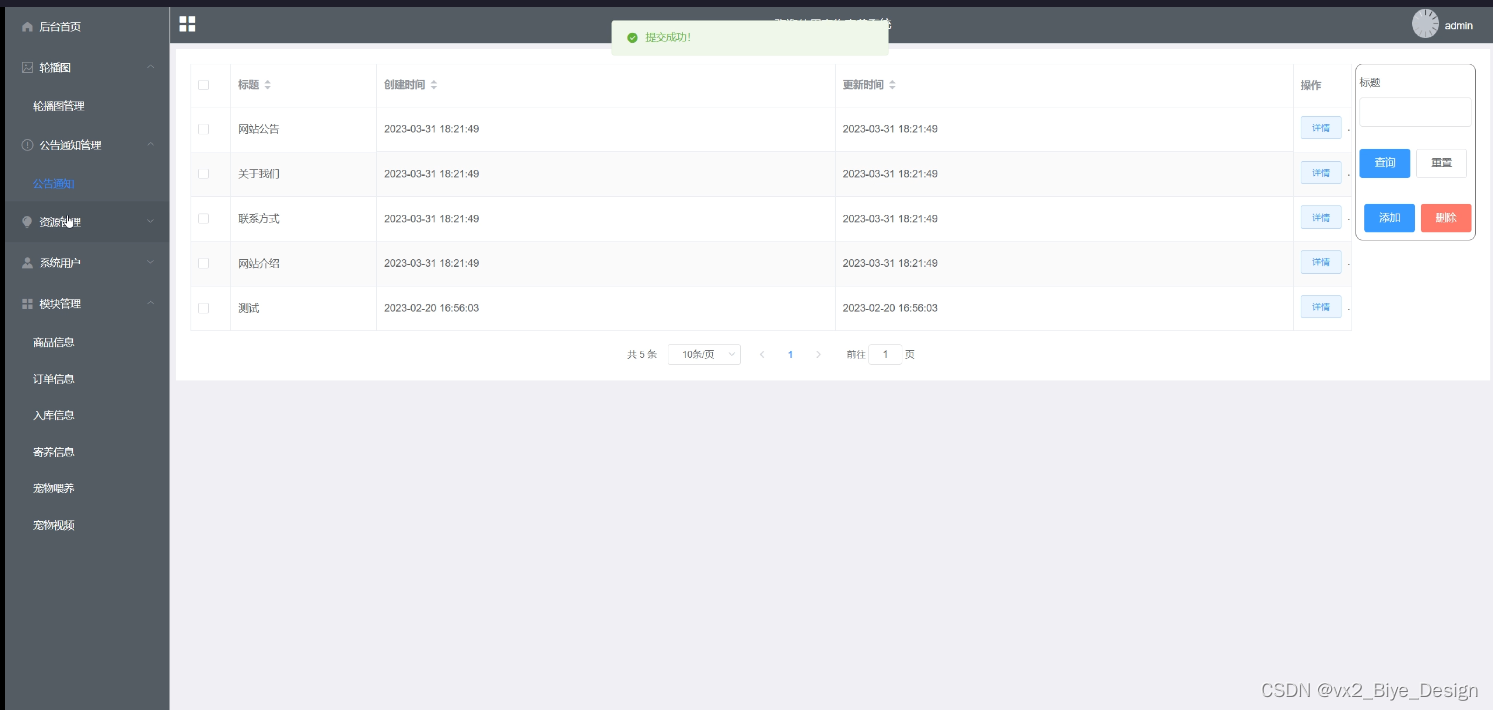 前端部分:前端框架采用了比较流行的渐进式pythonScript框架Vue.js。使用Vue-Router和Vuex实现动态路由和全局状态管理,Ajax实现前后端通信,Element UI组件库使页面快速成型,项目前端通过栅格布局实现响应式,可适应PC端、平板端、手机端等不同屏幕大小尺寸的完美布局展示。