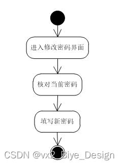 用户功能界面可对自己的密码进行修改。进入修改密码界面后核对当前密码,核对成功后填写新密码。修改密码活动图如下图所示。