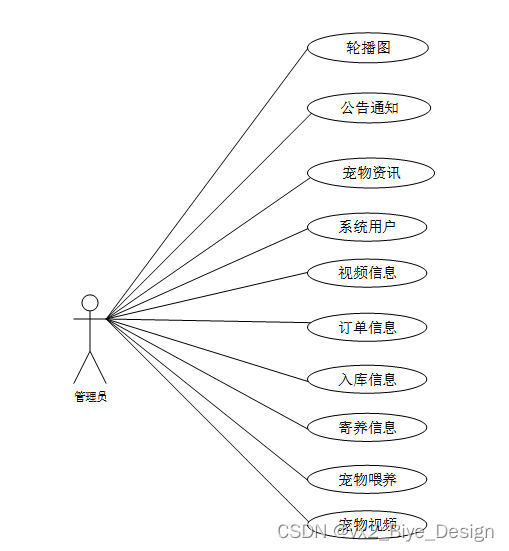 2.管理员主要负责用户管理、商品信息、订单信息、入库信息、寄养信息、宠物喂养、宠物视频,下图所示描述管理员的用例图。