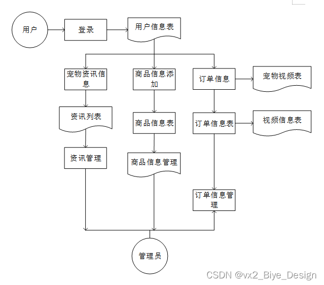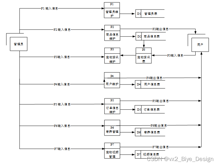 宠物寄养系统底层数据流图主要描述系统底层模块的数据流、数据载体、数据处理、外部实体的具体交互。本系统就是管理员和普通用户在用户管理、商品信息、宠物视频管理等模块上的数据交互。