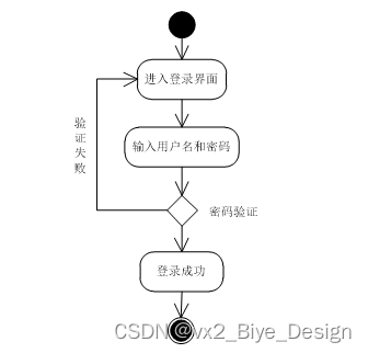 用户可进行登录使用更多功能,首先进入用户登录界面,输入用户账号和密码,后台对账号和密码信息进行核对验证,验证成功则页面直接显示登录用户昵称代表登录成功,否则返回用户登录界面。用户登录活动图如下图。