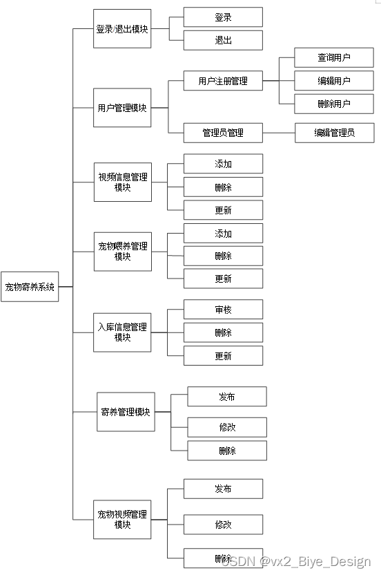 宠物寄养系统主要是为了更加地完善宠物寄养系统的服务情况,对用户的信息、商品信息等提供了方便的机制。本系统有多类使用者,分别是管理员和用户注册。以下是从这两种用户的角度分别介绍本系统所要实现的功能。