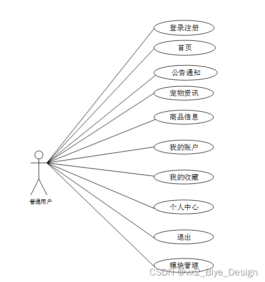 1.普通用户主要使用系统进行宠物寄养查询以及商品,下图所示为普通用户的用例