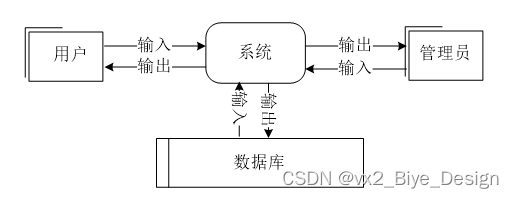 如下为系统的顶层数据流图,外部实体有用户和管理员,分别对系统输入数据,从而得到要输出的数据。