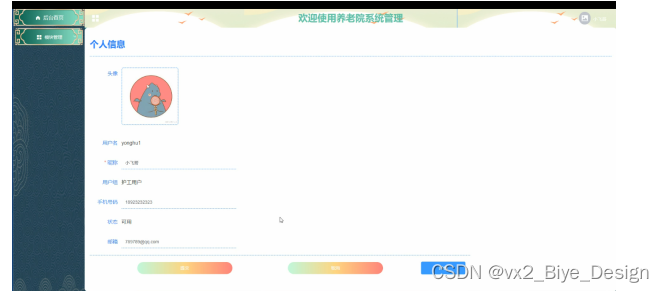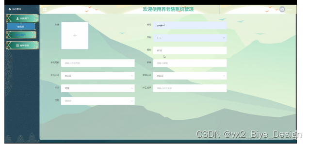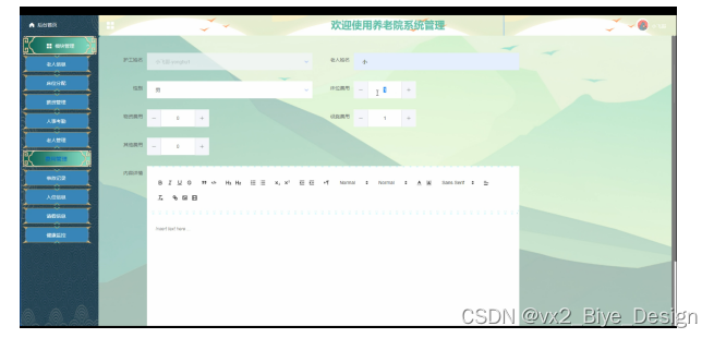 This design mainly realizes a nursing home system integrating the advantages of humanization, efficiency and convenience, and completes functional modules such as elderly information, salary management, asset management, personnel attendance, elderly management, expense management, accident record, bed type, occupancy information, leave information, health monitoring, asset type, etc. The system communicates with the server through the browser to realize data interaction and change. You can operate the system by moving your fingers through a computer to realize data communication management. The design process of the whole system fully considers the safety, stability and reliability of data, and the operation process is simple. The system improves work efficiency and reduces errors and omissions in data storage through scientific management and convenient services.