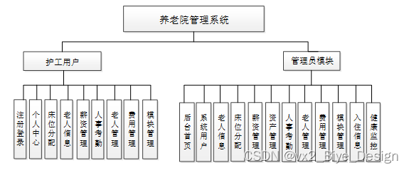 系统设计的目的是分析系统包括的所有功能结构,为开发人员设计开发和实现系统做好准备工作。经过前期的需求调查、分析和整理之后,确定的总体需求主要包括多个模块,分别是:房间信息、床位申请、分配管理、上报管理、日常记录、缴费信。系统整体角色分为两个部分,一是护工用户、二是管理员。权限分布也是很明显,游客即是无需任何验证便可浏览相关信息;护工用户是在除去浏览信息之外还具有查询和管理自己账户信息、个人资料修改、护工用户注册查看、床位分配、薪资管理、人事考勤、老人管理、费用管理、事故记录、入住信息、请假信息、健康管理操作等权限;管理员是最高权限拥有者。