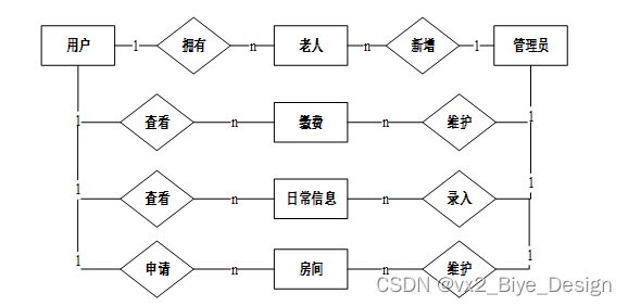 对于一个要开发的系统来说,E-R图可以让别人能更快更轻松的了解此系统的事务及它们之间的关系。根据系统分析阶段所得出的结论确定了在养老院系统中存在着多个实体分别是用普通用户、管理员、老人、账单、护工用户、工资、请假、留言。