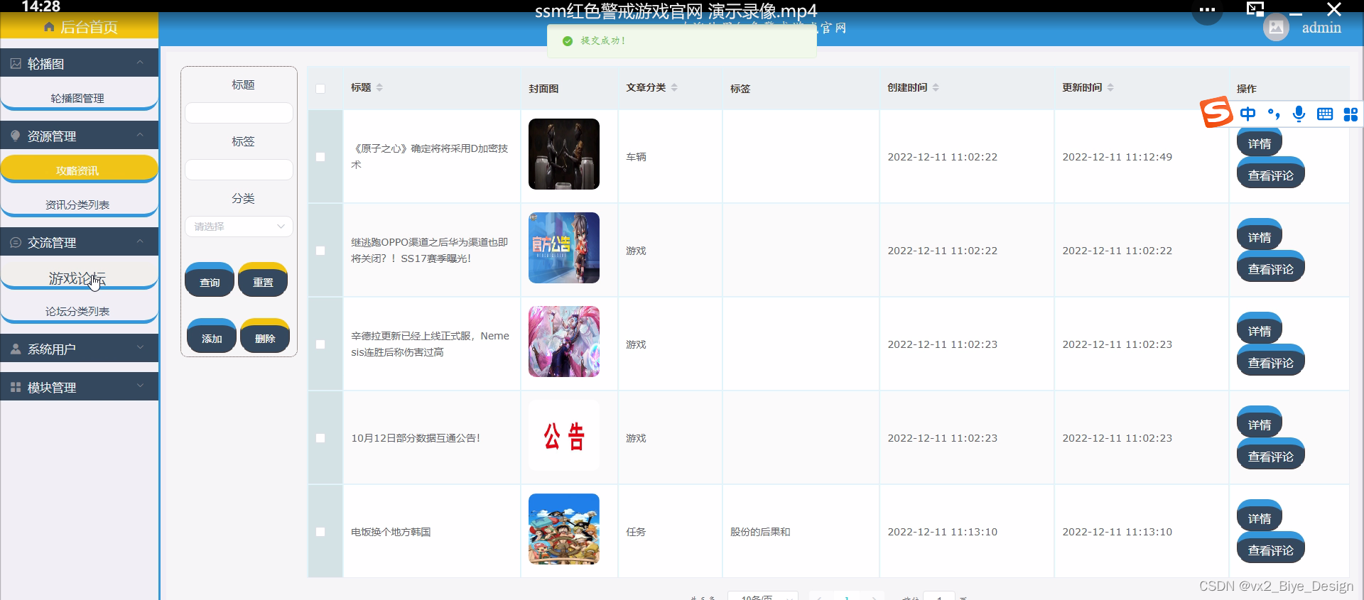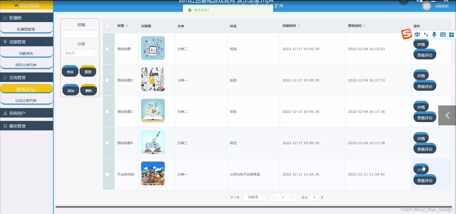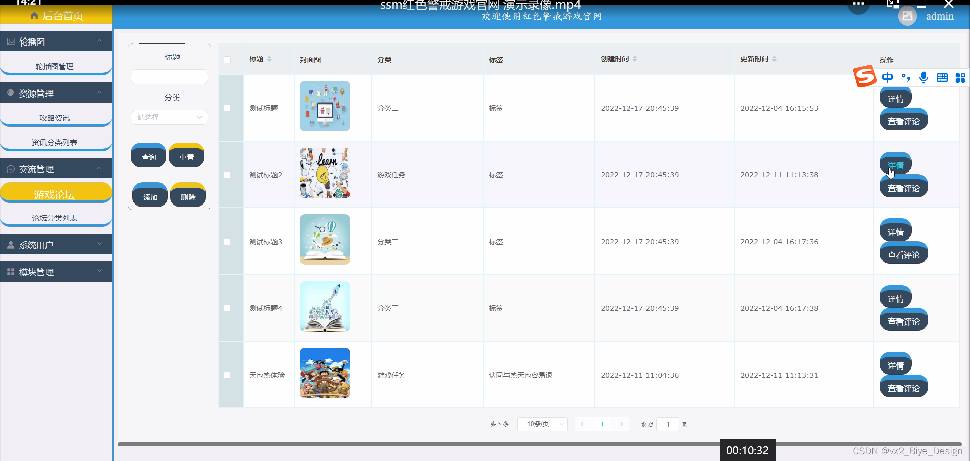 游戏论坛,在游戏论坛页面可以查看标题、分类、图片等信息,并可根据需要对游戏资讯进行详情,修改,删除或查看详细内容等操作,如图5-8所示。